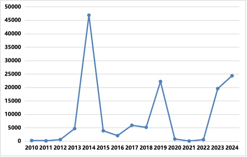 2010-2024年中國登革熱病例報告數(shù)