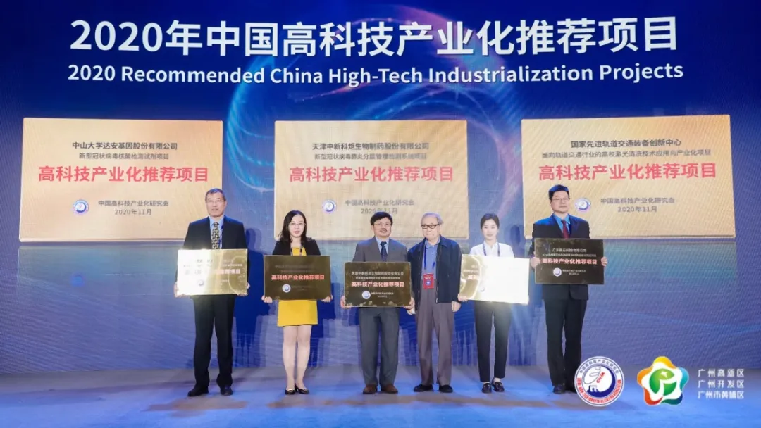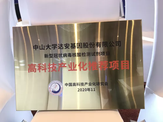 中山大學(xué)達(dá)安基因股份有限公司根據(jù)《高科技產(chǎn)業(yè)化推薦項(xiàng)目申報(bào)、評(píng)選辦法》的有關(guān)要求,及時(shí)提交了“新型冠狀病毒核酸檢測(cè)試劑項(xiàng)目”的項(xiàng)目申報(bào)書(shū)。由相關(guān)專(zhuān)業(yè)的院士、專(zhuān)家、企業(yè)家組成的評(píng)選委員會(huì)通過(guò)對(duì)申報(bào)材料進(jìn)行謹(jǐn)慎且專(zhuān)業(yè)的審查、評(píng)議,并由中高會(huì)理事長(zhǎng)會(huì)批準(zhǔn)并公示后,本項(xiàng)目最終獲得由中高會(huì)頒發(fā)的“高科技產(chǎn)業(yè)化推薦項(xiàng)目”稱(chēng)號(hào)及牌匾。
