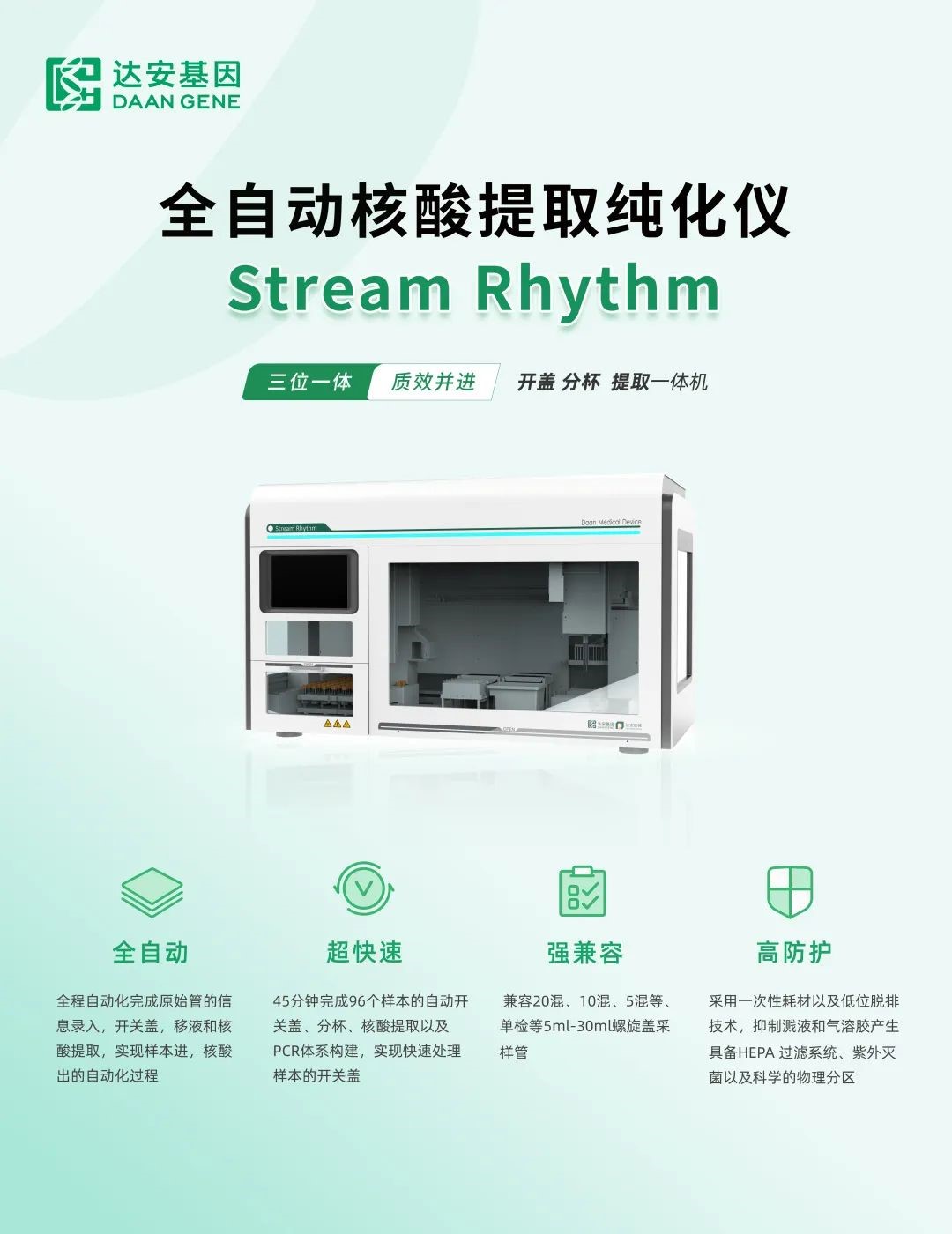 近日,達(dá)安基因推出Stream Rhythm全自動(dòng)核酸純化儀(備案號(hào):粵穗械備20220489),兼容原始管帶蓋上機(jī),自動(dòng)化完成樣本信息錄入、樣本開(kāi)關(guān)蓋、樣本轉(zhuǎn)移、核酸提取純化以及PCR體系構(gòu)建等核酸檢測(cè)前處理的全過(guò)程,簡(jiǎn)化實(shí)驗(yàn)室工作流程,大幅度提升實(shí)驗(yàn)室工作效率,降低操作人員的工作強(qiáng)度,解放檢驗(yàn)人員雙手。Stream Rhythm一機(jī)多用,實(shí)現(xiàn)分子實(shí)驗(yàn)室自動(dòng)化、集成化以及系統(tǒng)化樣本前處理功能。