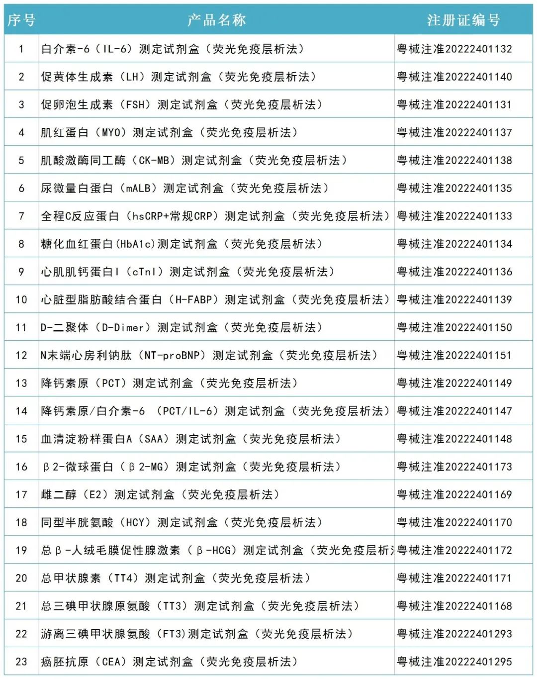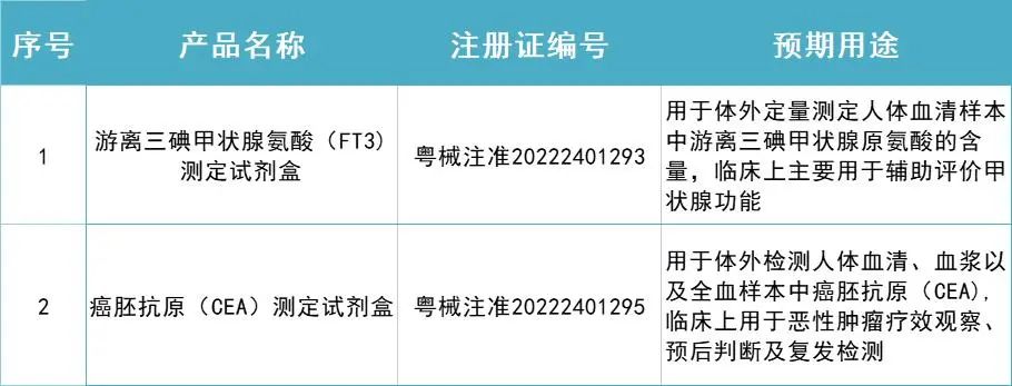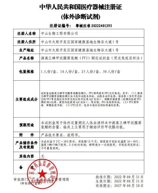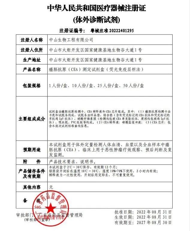 達(dá)安基因下屬全資子公司中山生物工程有限公司,2項(xiàng)產(chǎn)品于2022年9月2日又獲廣東省藥品監(jiān)督管理局頒發(fā)的《醫(yī)療器械注冊證》。分別是游離三碘甲狀腺氨酸(FT3)測定試劑盒(熒光免疫層析法)、癌胚抗原(CEA)測定試劑盒(熒光免疫層析法)。