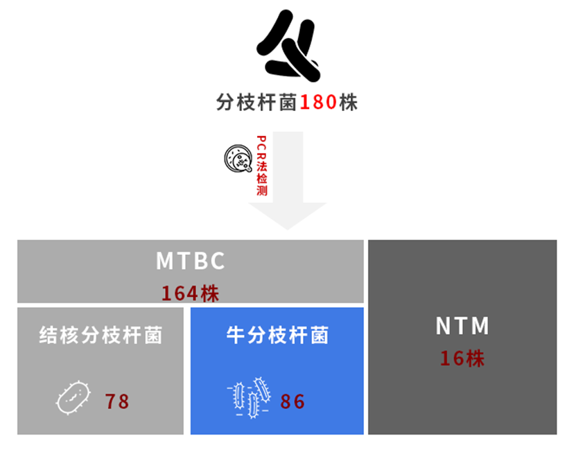 有文獻(xiàn)研究數(shù)據(jù)表示,在上海市某醫(yī)院結(jié)核患者中,對(duì)180株分枝桿菌陽(yáng)性培養(yǎng)物進(jìn)行PCR法檢測(cè),其中16株為非結(jié)核分枝桿菌,164株為結(jié)核分枝桿菌復(fù)合群。對(duì)結(jié)核分枝桿菌復(fù)合群進(jìn)行特異性分析,其中78株為結(jié)核分枝桿菌,剩余86株為牛分枝桿菌??梢?jiàn),牛分枝桿菌在結(jié)核患者中也有較高的比例,不容忽視。