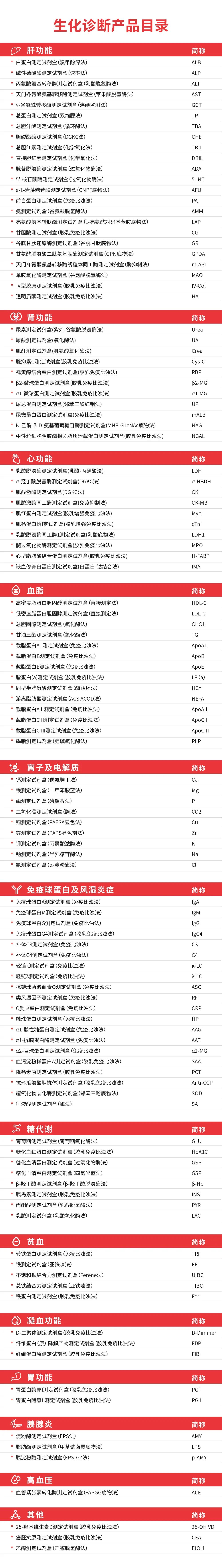 達安基因目前已經(jīng)擁有多臺不同通量的全自動生化分析儀,滿足不同規(guī)模的實驗室的需求。此外,還配套了12個大類共112個項目的生化試劑,涵蓋了肝功能、腎功能、心功能、血脂、離子及電解質(zhì)、免疫球蛋白與風濕炎癥、糖代謝、貧血、凝血功能、胃功能、胰腺炎、高血壓等。試劑性能優(yōu)越,品類豐富,貨源充足。下面是生化診斷試劑產(chǎn)品目錄: