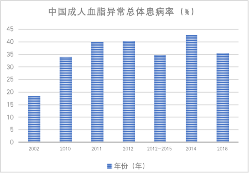近幾十年來(lái),中國(guó)人群的血脂水平、血脂異?;疾÷拭黠@增加,以高膽固醇血癥的增加最為明顯。2018年全國(guó)調(diào)查結(jié)果顯示,≥ 18歲成人血脂異??偦疾÷蕿?35.6%。