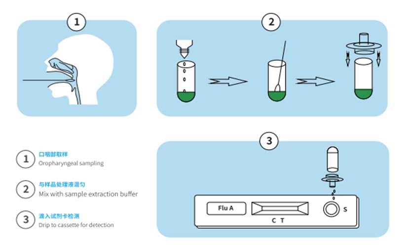 甲型流感病毒抗原檢測試劑操作十分簡便。 根據(jù)試劑說明書,只需將采集樣本后的咽拭子立即置于采樣管中,拭子頭應在保存液中充分混勻,同時用手隔著采樣管外壁擠壓拭子頭,確保樣本充分洗脫于采樣管中。